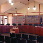 The interior of the building has vinyl wall covering and paint, wood doors and trim. Ceramic tile, vinyl tile, and carpet are all used throughout the facility which is also home the to the City Council chambers and a museum. The entrance lobby has a tiled design depicting the City’s logo.